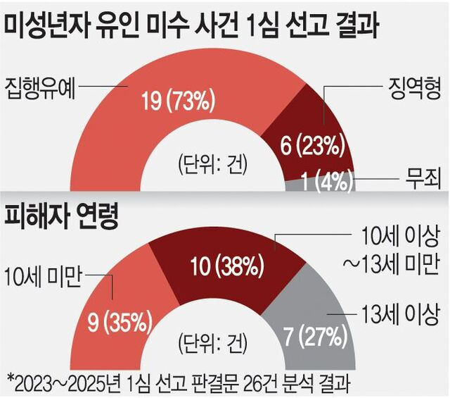 - 국민일보 분석에 따르면, 2023~2025년 1심 선고된 미성년자 유인미수 사건 26건 중 73%가 13세 미만 피해자.