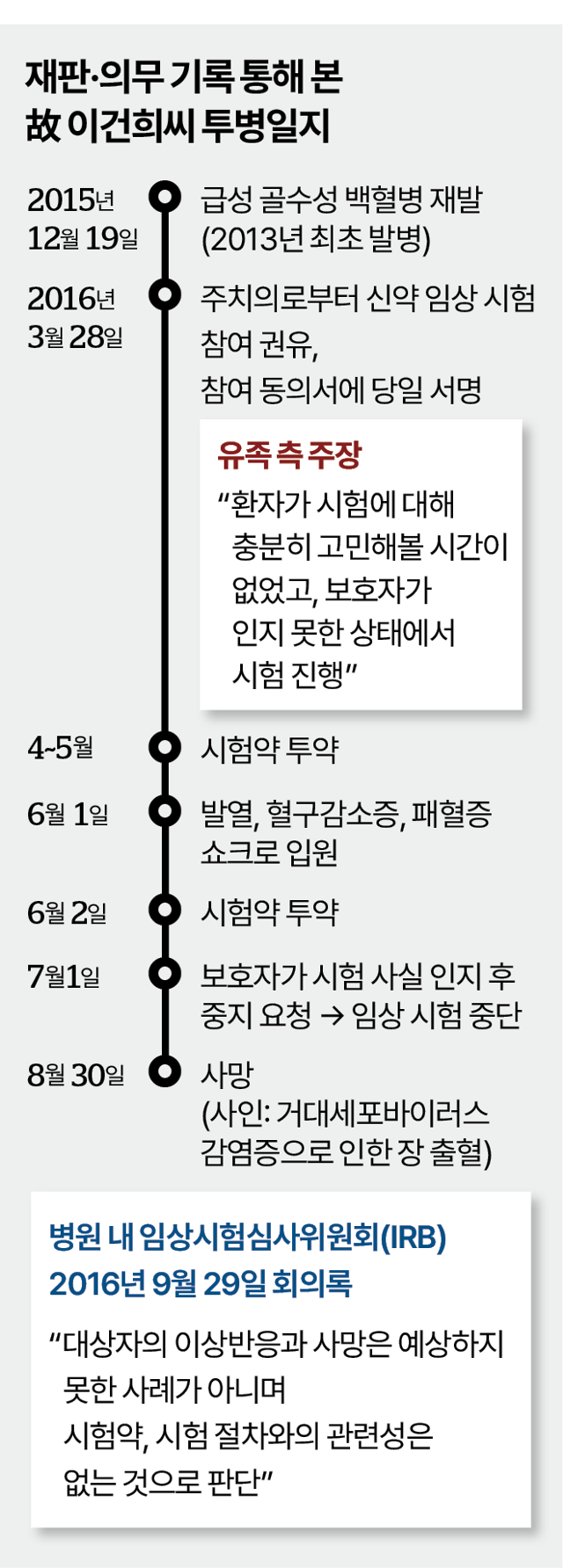 - 사망 경위: 임상시험 중 패혈증으로 중환자실 입원, 이후 사망