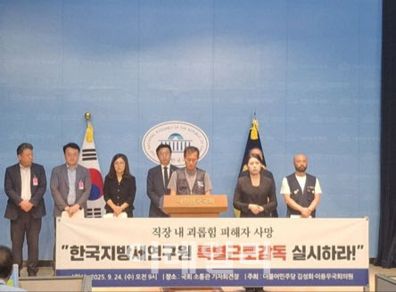 지난 9월 이용우 더불어민주당 의원, 공공운수노조, 한국지방세연구원 지부가 국회에서 연구원에 대한 특별근로감독을 요구하는 기자회견을 열었다. 사진제공=공공운수노조 “ “벽에 막힌 것
